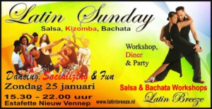 Zondag 25 januari: Latin Sunday. Een gezellige Latin Party in de sfeervolle zaal van De Estafette in Nieuw Vennep. We gaan van start met leuke, leerzame workshops daarna nemen onze resident DJ’s het over. Zij laten hun mooiste Salsa, Bachata en Kizomba muziek horen.
