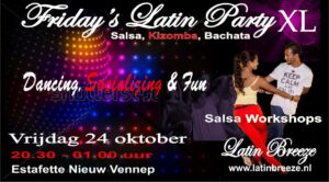 Salsa, Bachata, Kizomba. Tijd: 20.45 – 23.00 uur. Locatie: VOKA, Vierlingsbeeklaan 24, Amstelveen. Entree: €5 p.p.