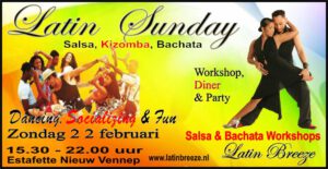 Zondag 22 februari: Latin Sunday. Een gezellige Latin Party in de sfeervolle zaal van De Estafette in Nieuw Vennep. We gaan van start met leuke, leerzame workshops daarna nemen onze resident DJ’s het over. Zij laten hun mooiste Salsa, Bachata en Kizomba muziek horen.